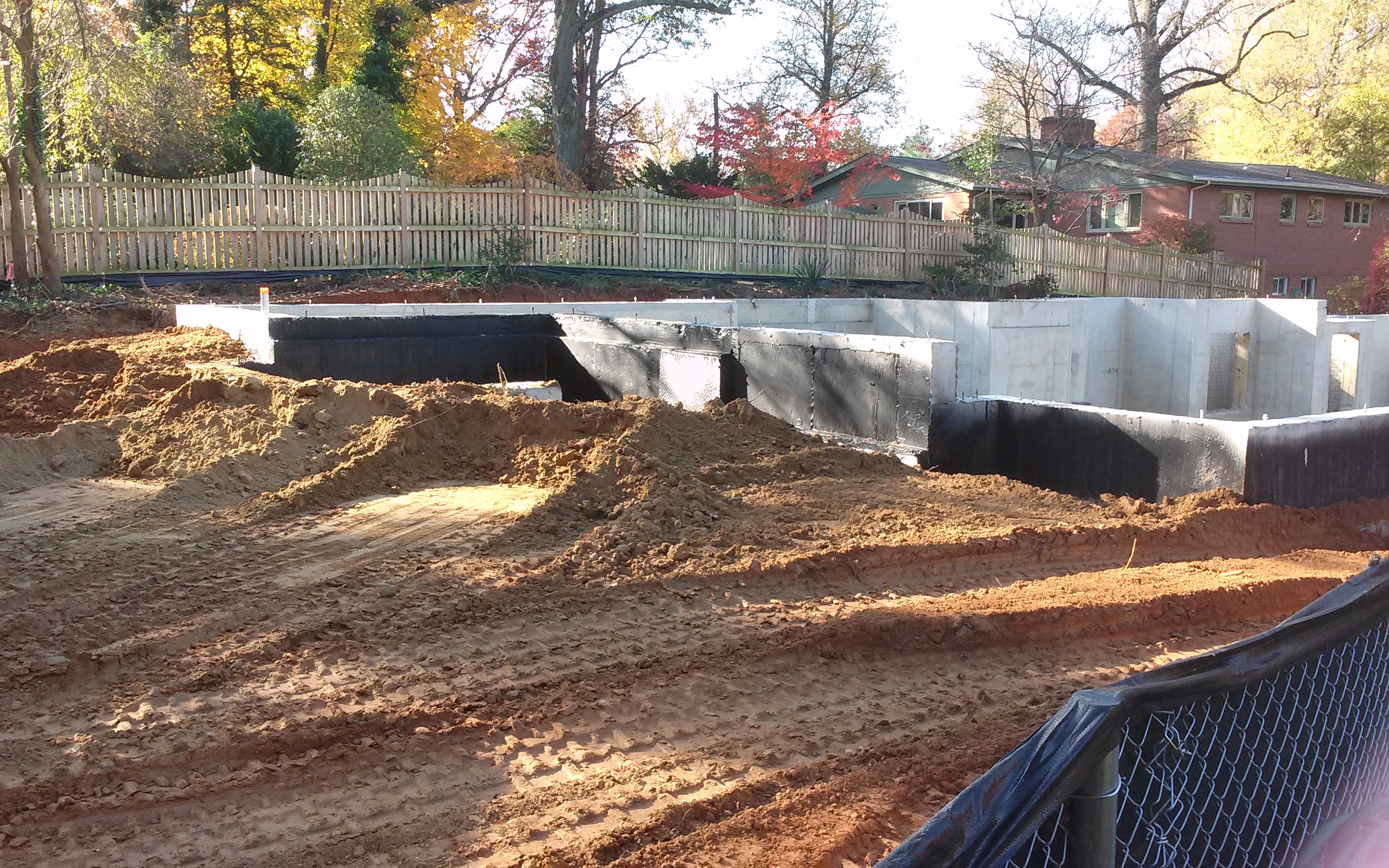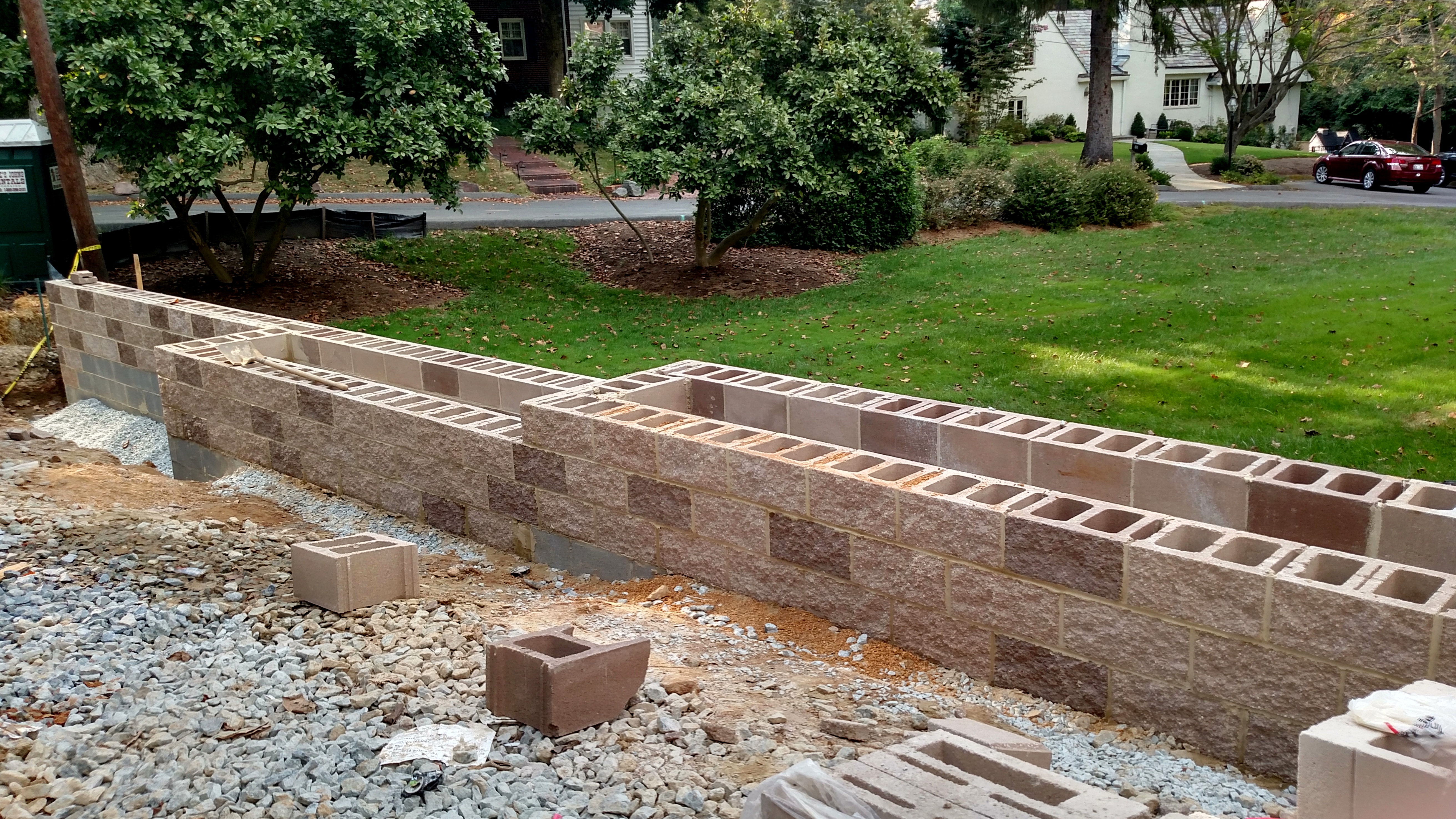 As Summer ends, we are finally starting some of the finishes, inside and out. A retaining wall/planter is going up on the northwest side, built of split block.
