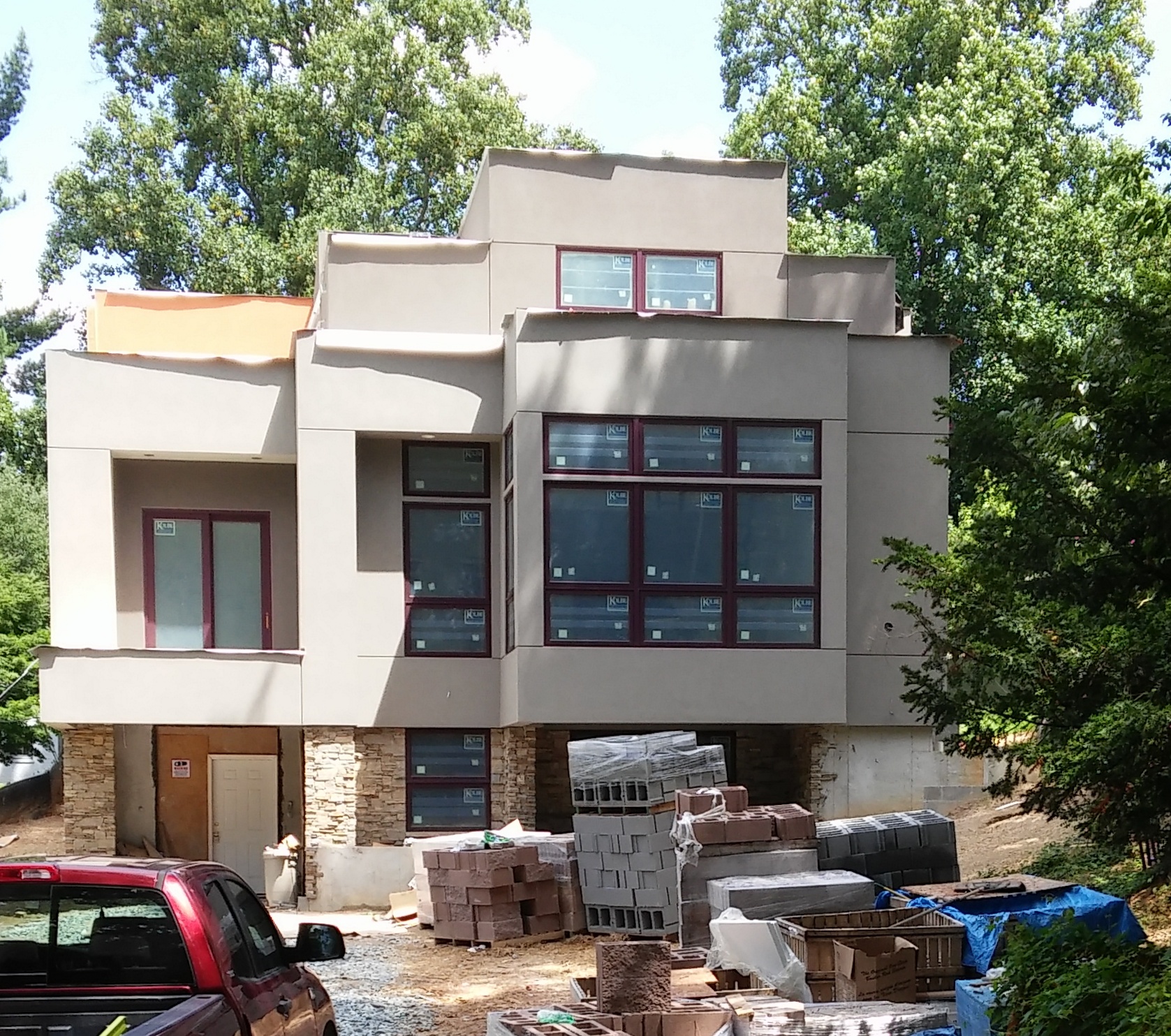 From the front, windows and dryvit finished, but now waiting for the roofcapping to be completed. Stone still in progress, new front door will not be put in place until concrete porch/pad installed.