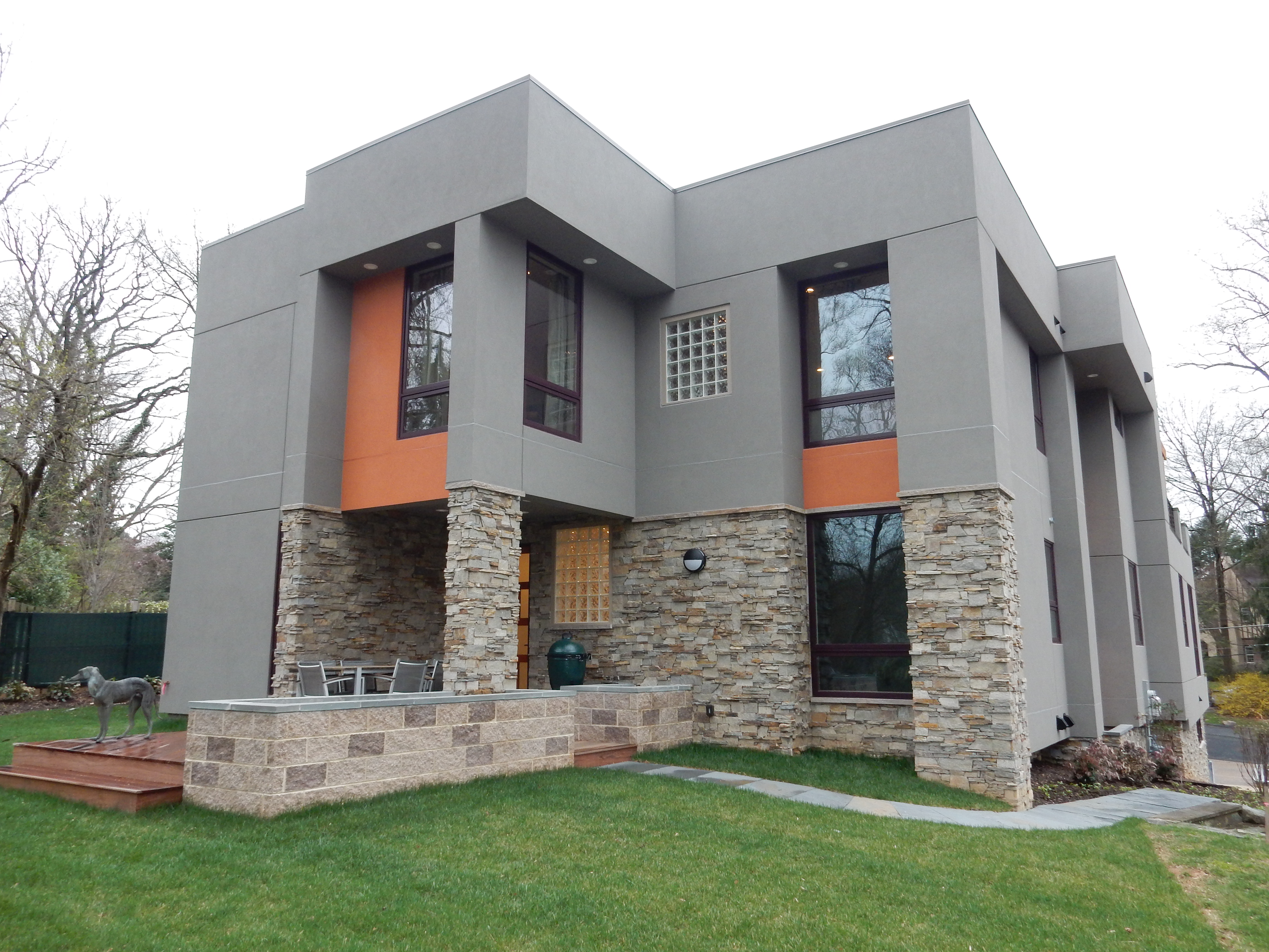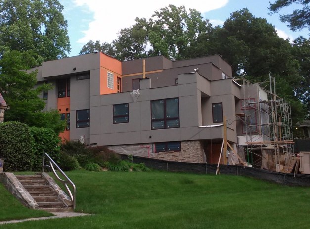 From Lynn: It’s been a fascinating month, watching the house come into shape as both the exterior and interior structure gets covered. Drywall is going up very fast inside; exterior stone veneer is in place and dryvit–a form of acrylic plaster– is going up and color is going on. We are now taking over as contractors for the interior and bringing in our subs, so lots of decisions, meetings, phone calls, purchases and coordination. Whew. Its a lot. See the exterior finishes below.