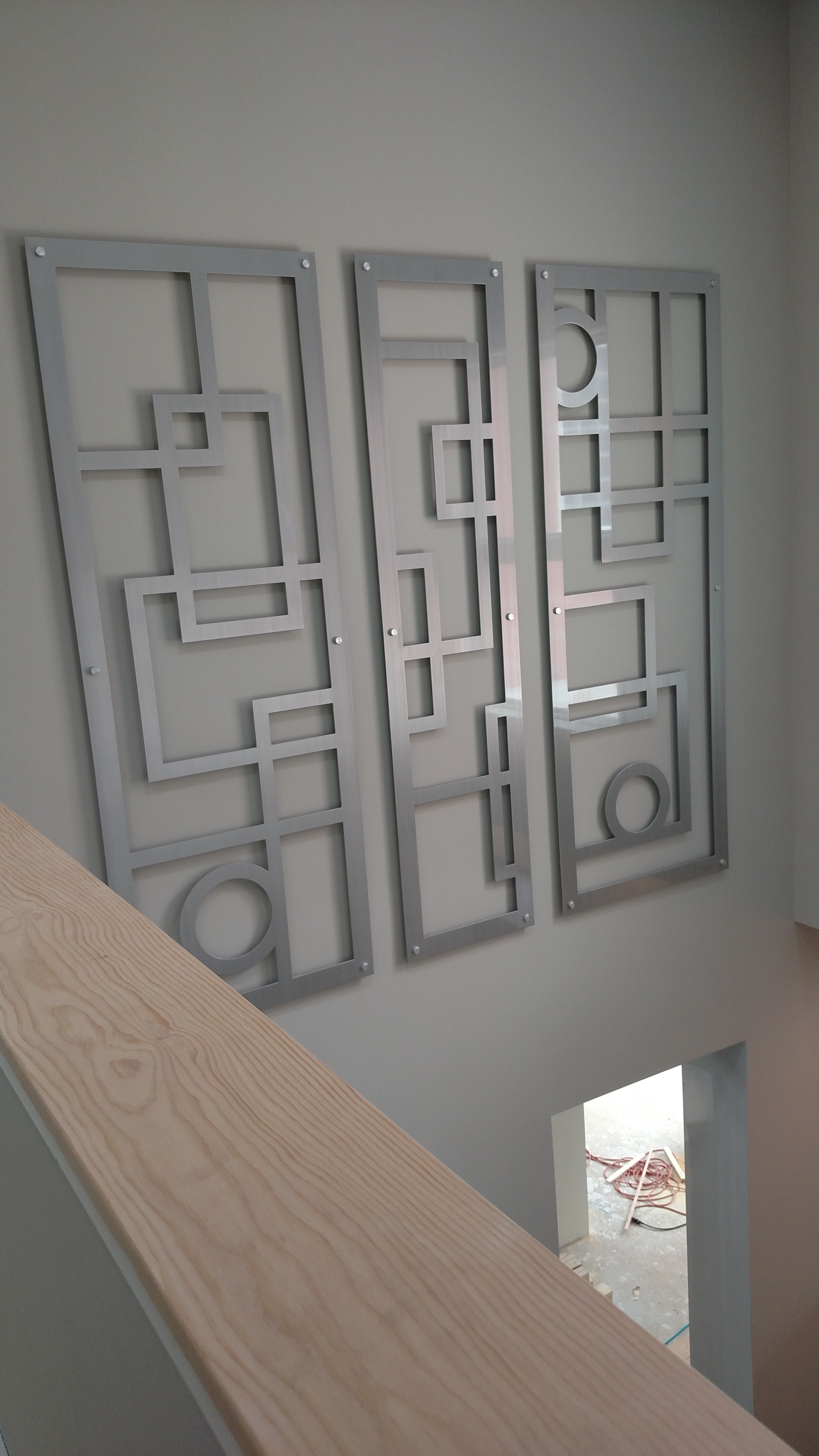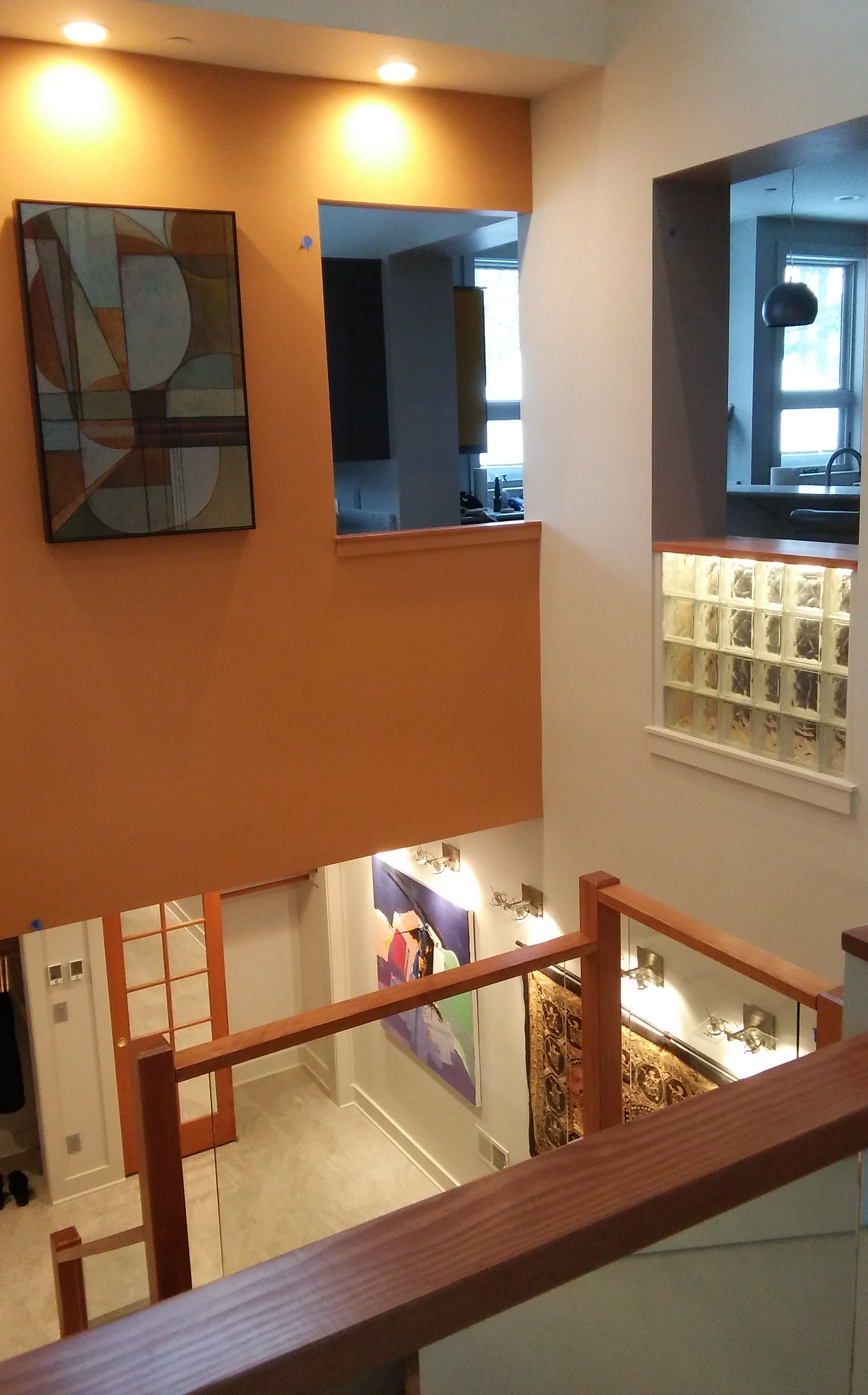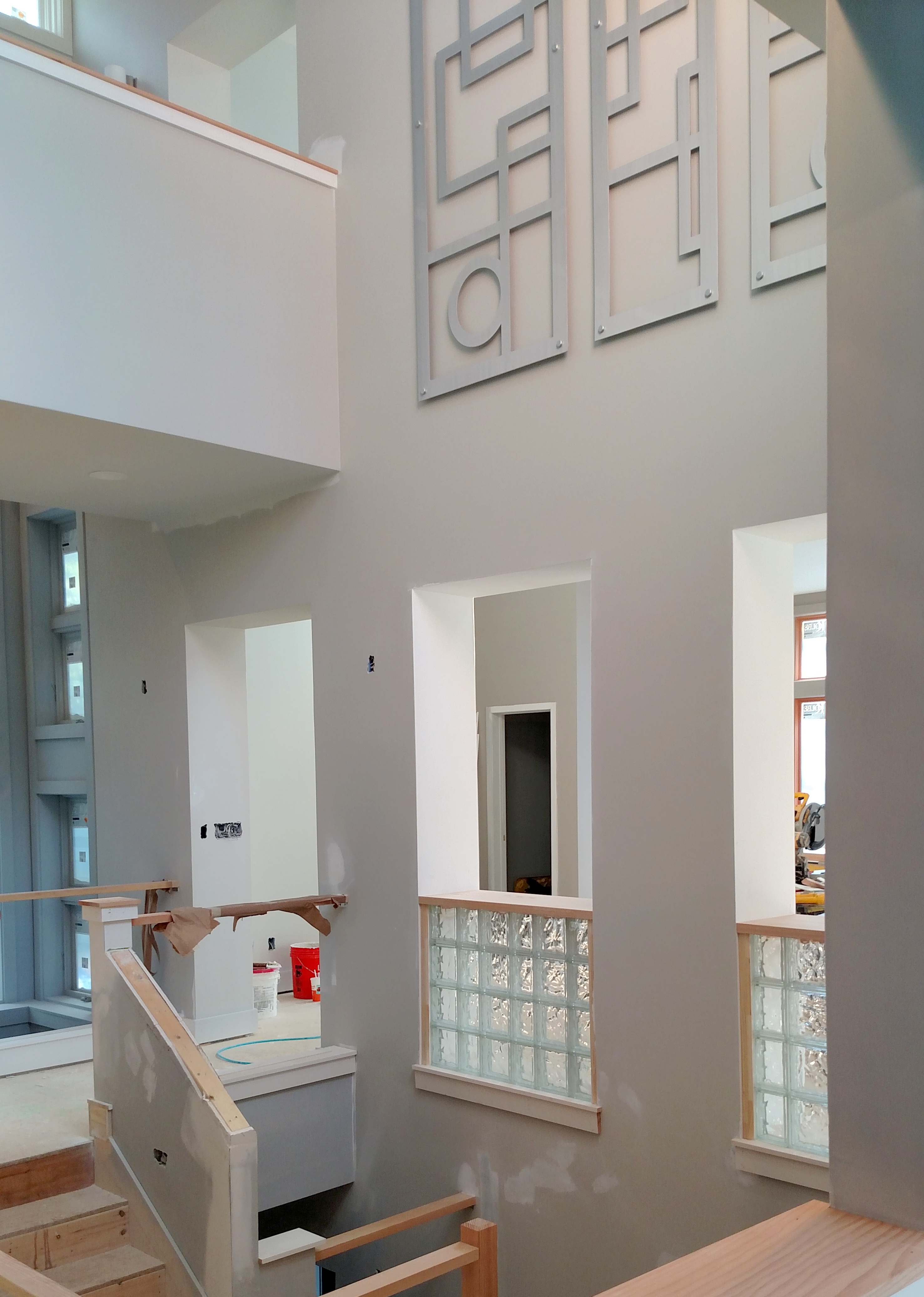 One big exciting finish is this piece of wall art, 8′ x 8′, commissioned for us from an artist in Michigan, hanging on the top floor of the atrium. Staircase and wall inserts with glass block are also getting done.