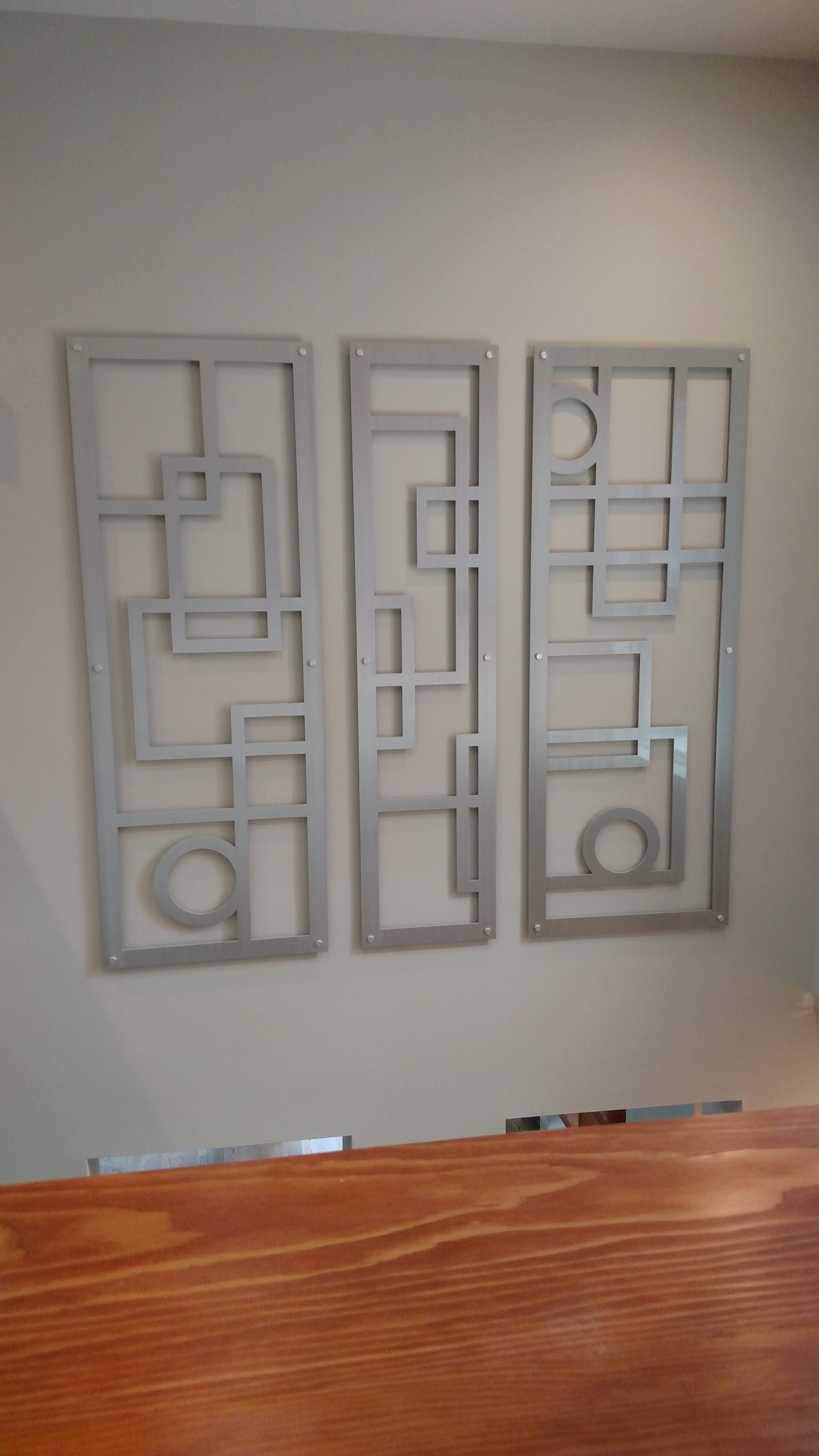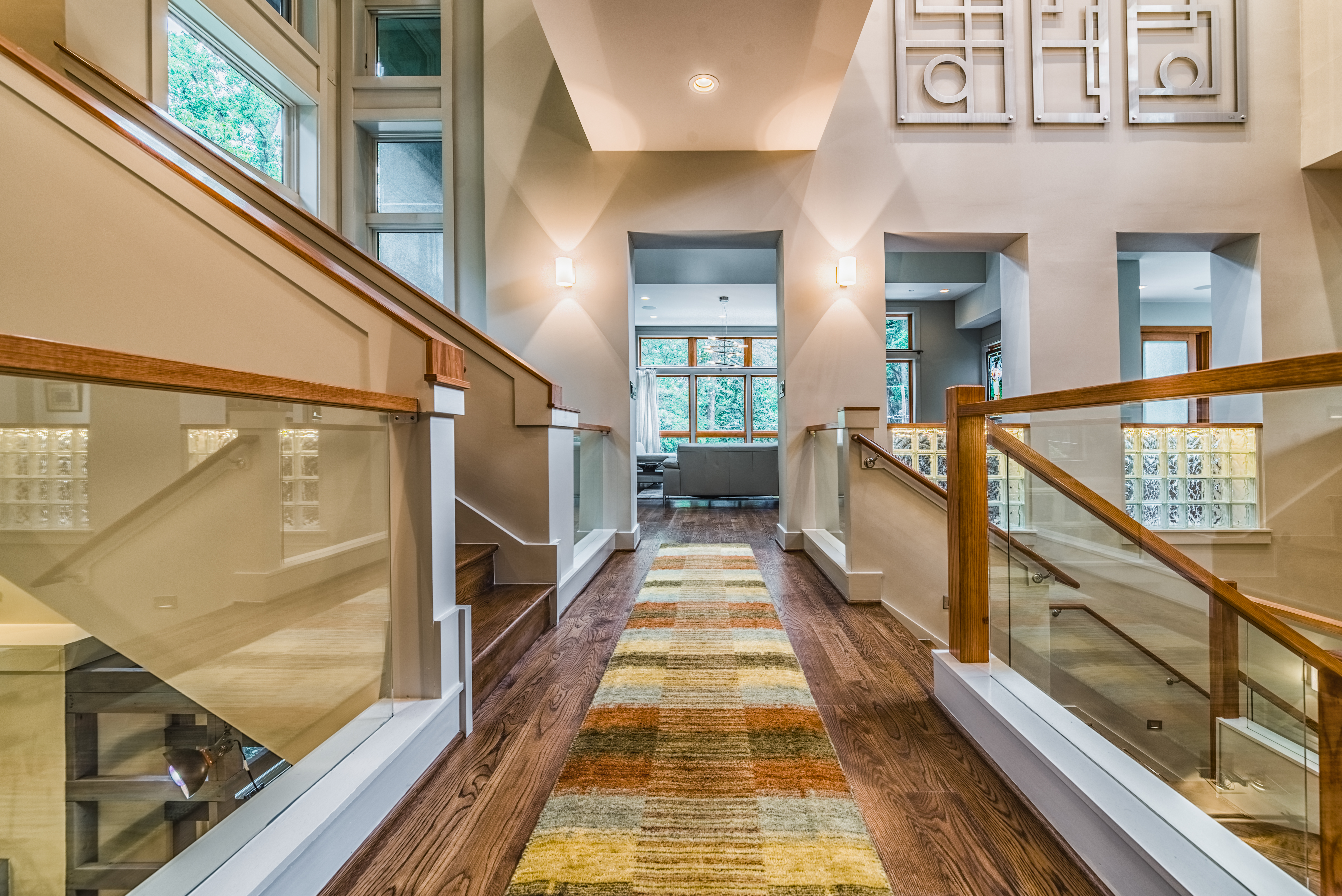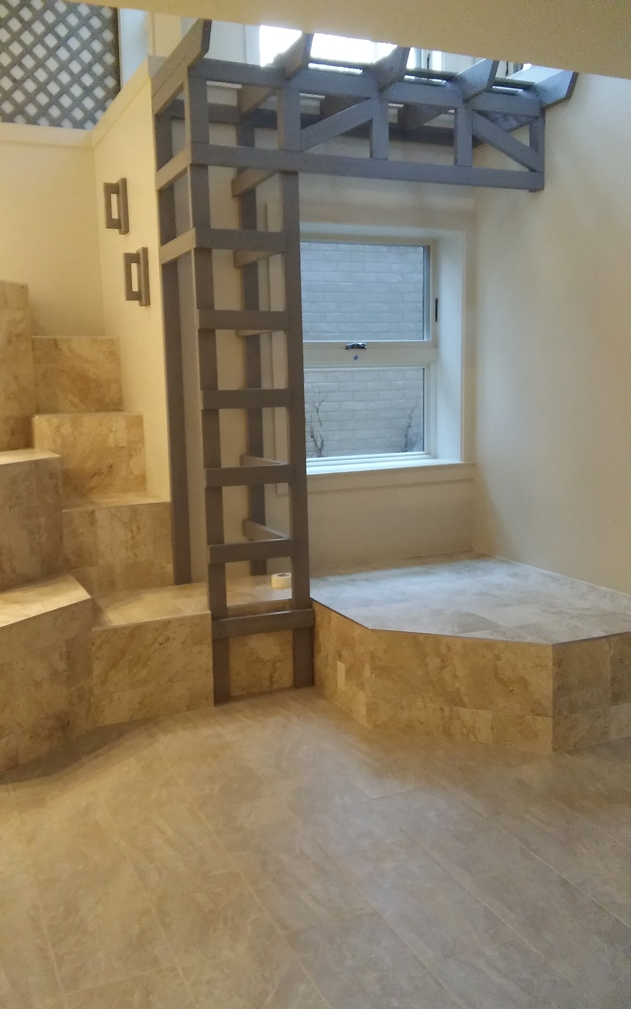 One big exciting finish is this piece of wall art, 8′ x 8′, commissioned for us from an artist in Michigan, hanging on the top floor of the atrium. Staircase and wall inserts with glass block are also getting done.