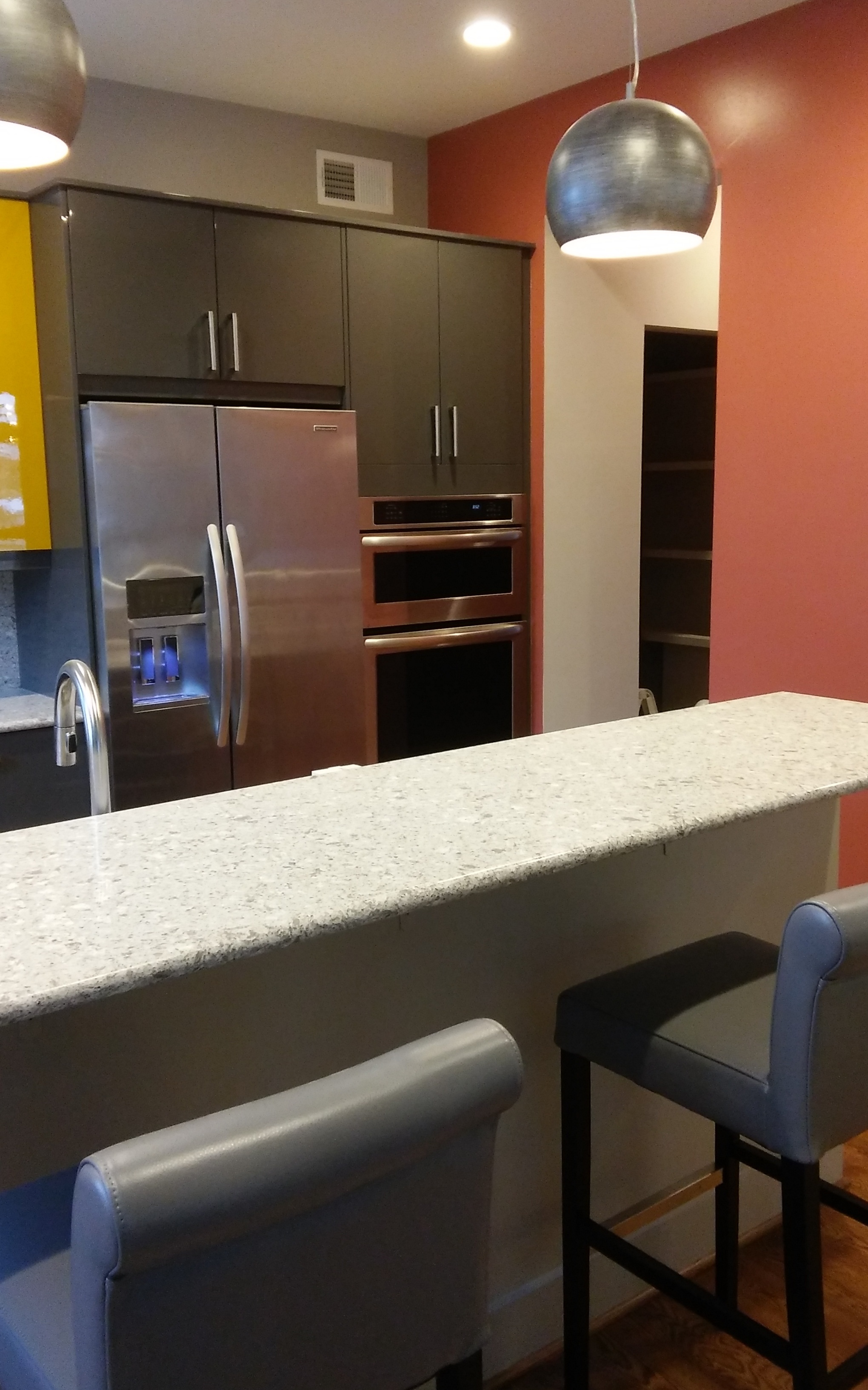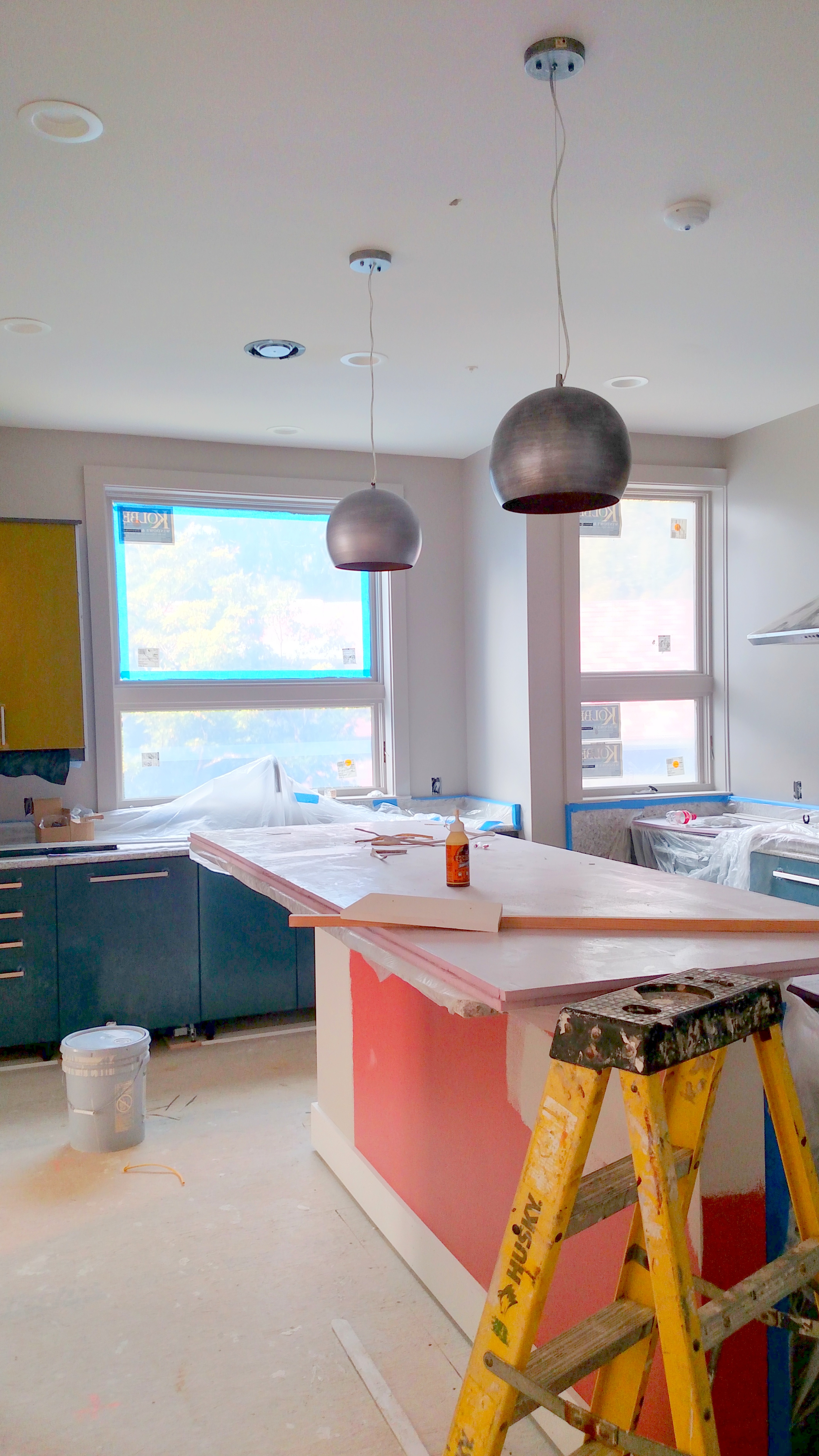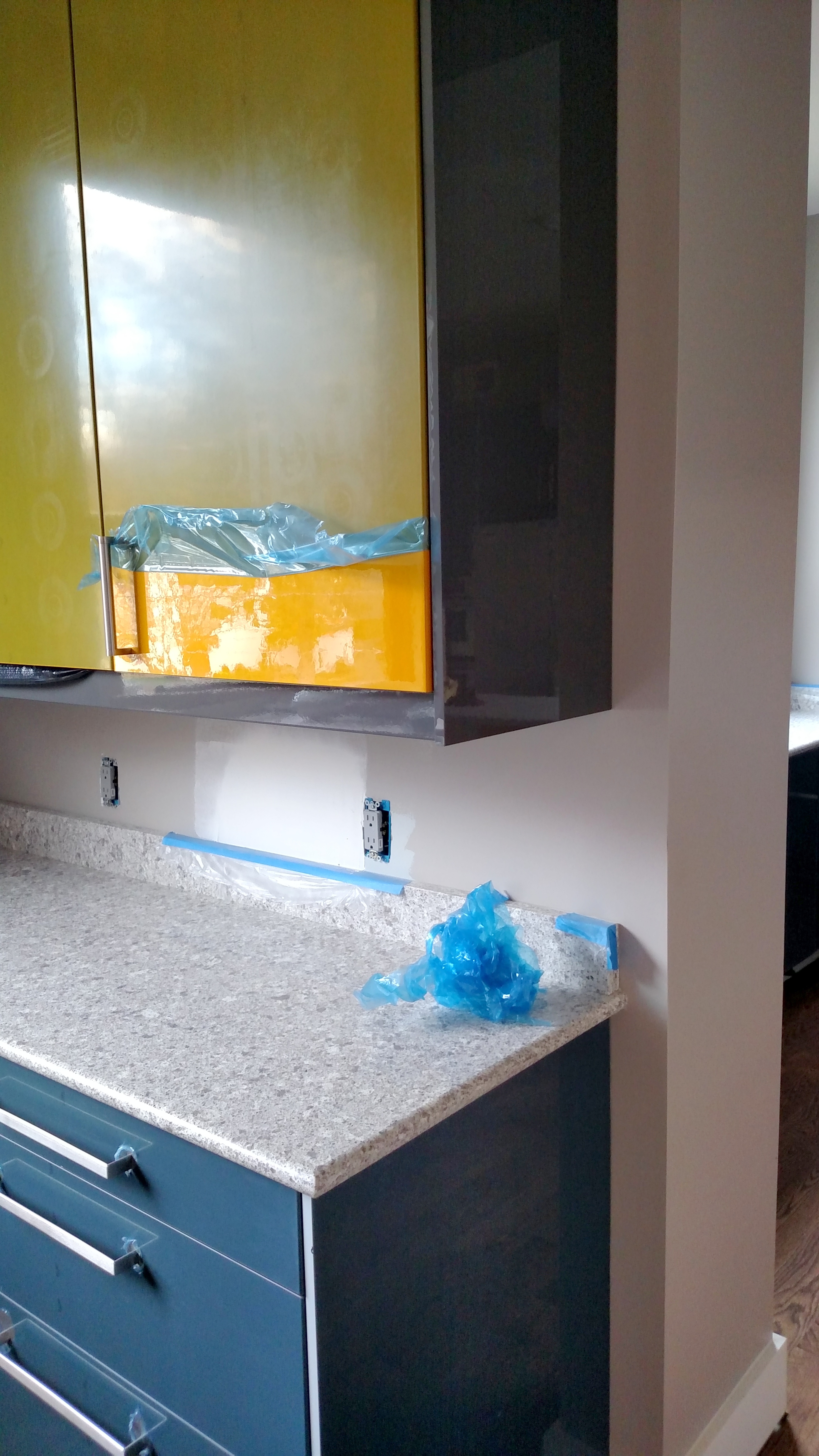The kitchen is also in process and we are able to begin to peel back the blue film that covers all the cabinets to see their true colors (grey and yellow).