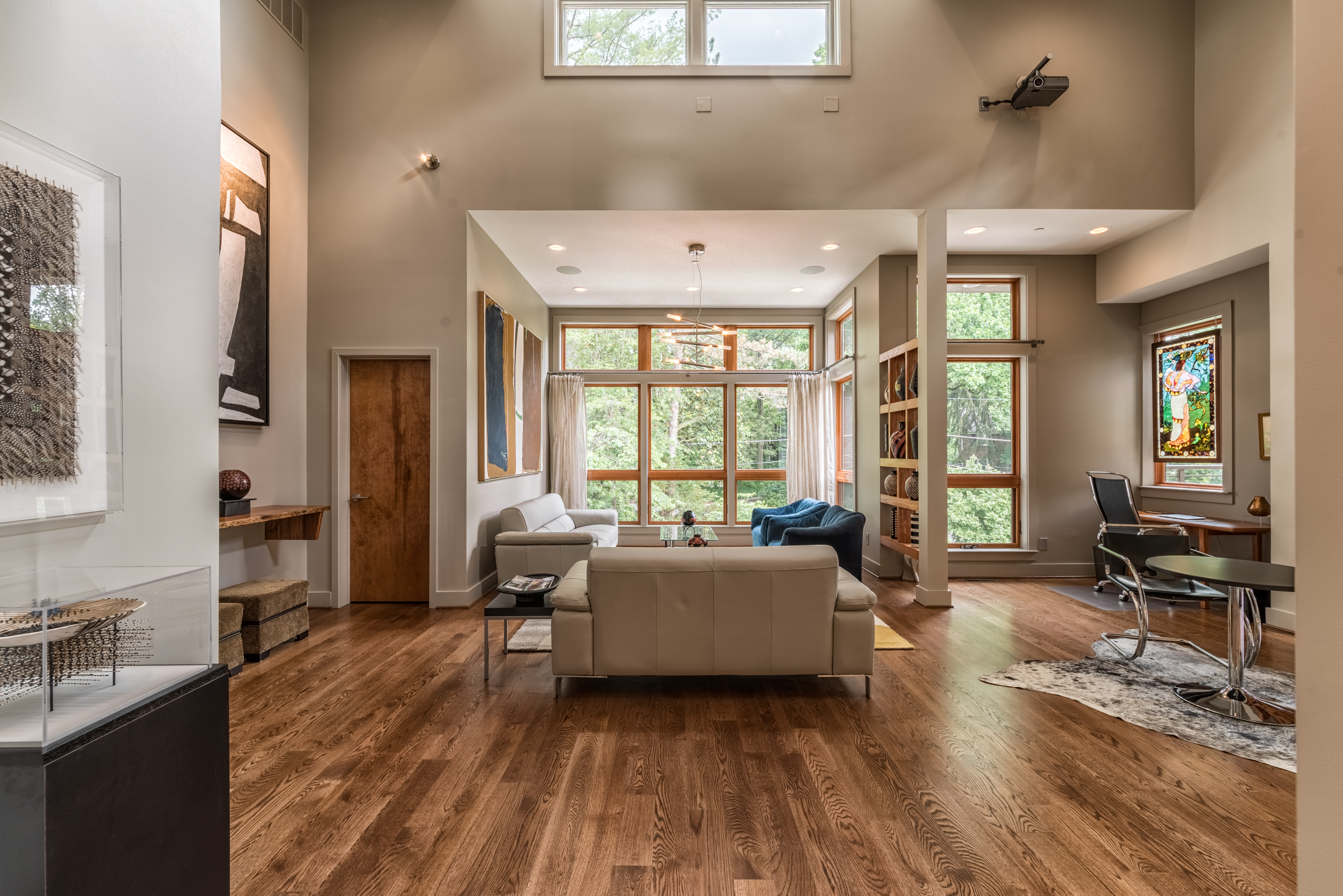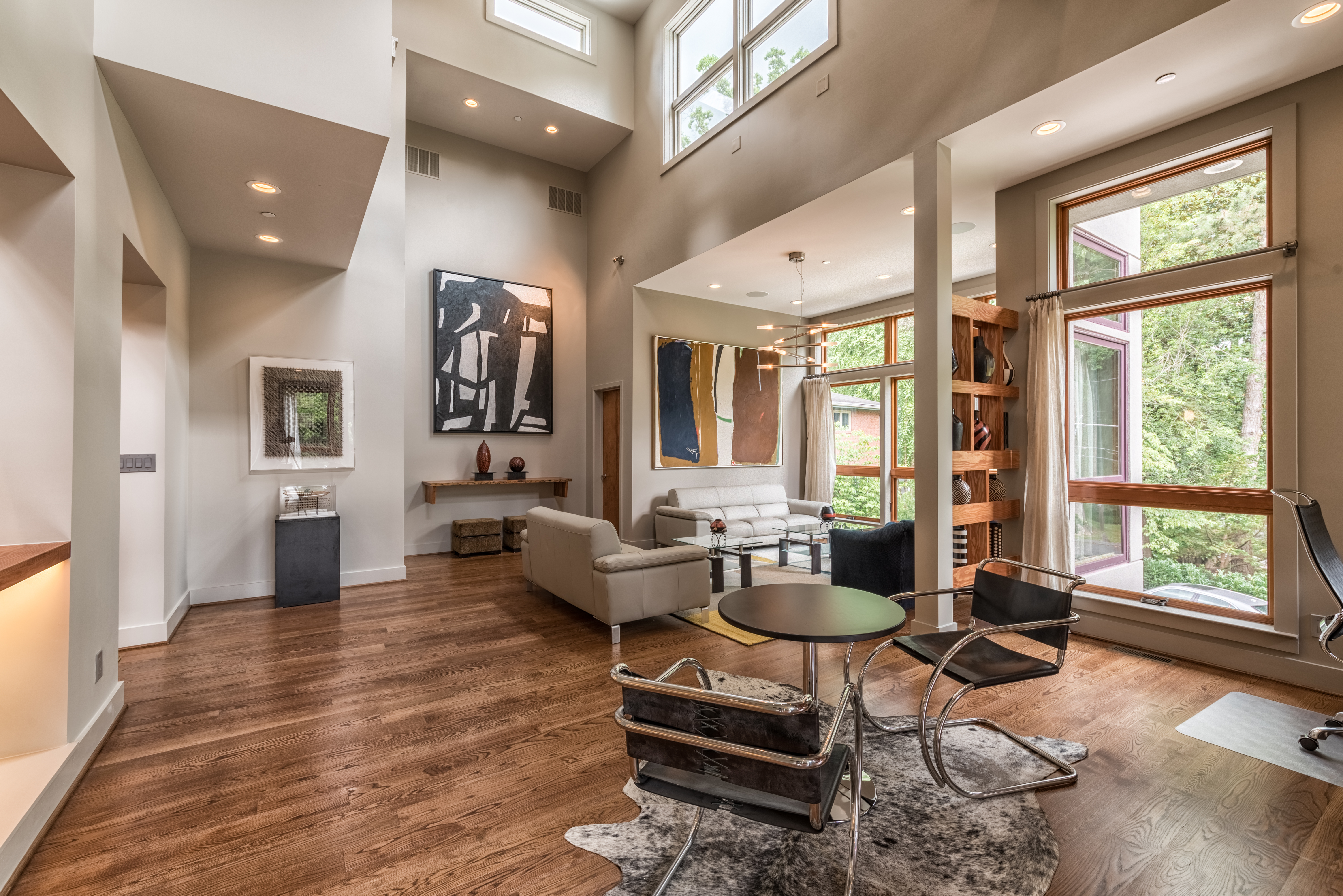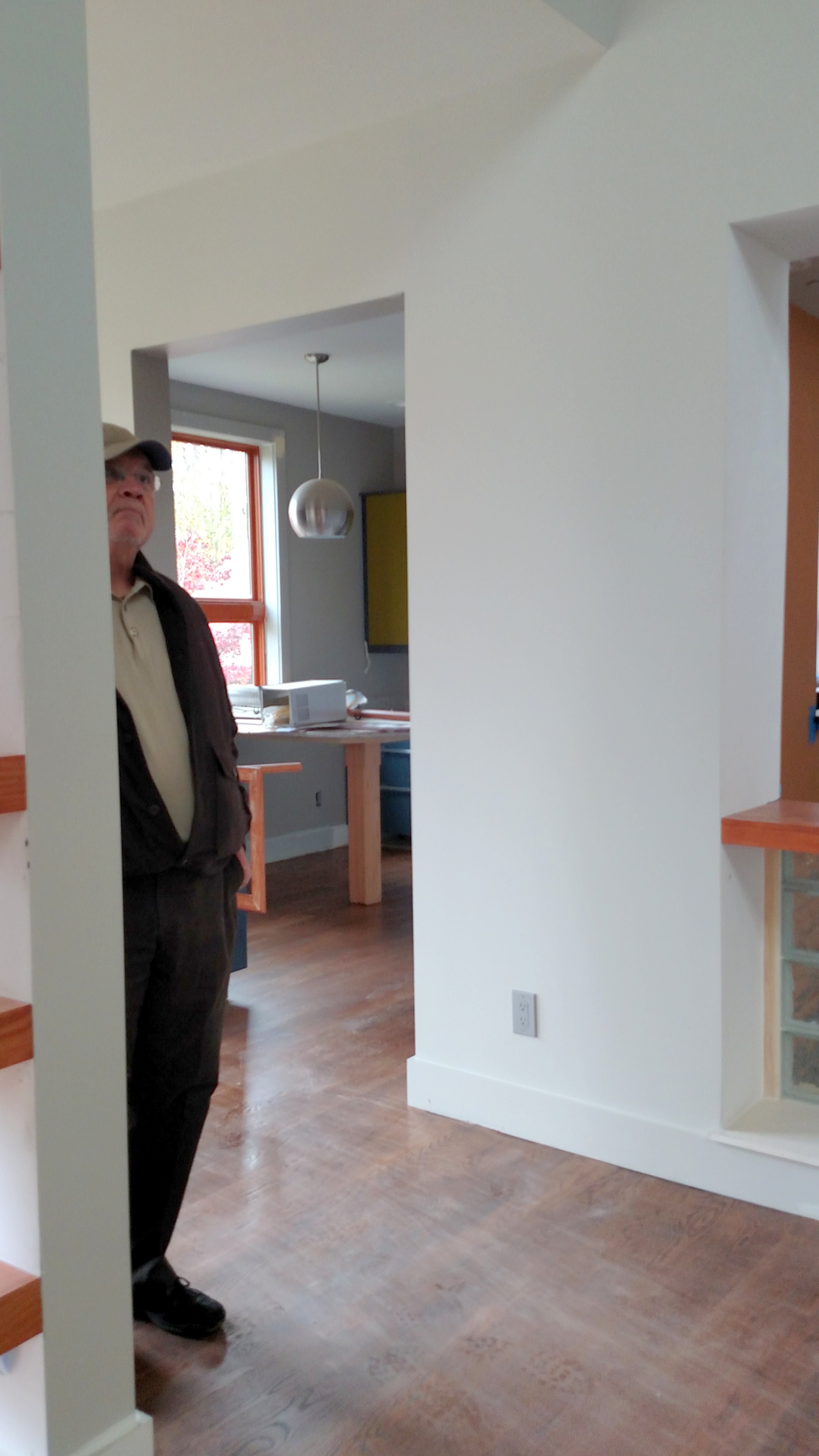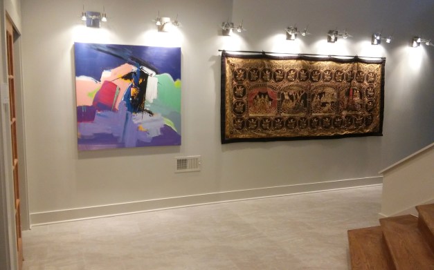 Tad in living room, waiting for furniture above, furniture in place with new art going in, below