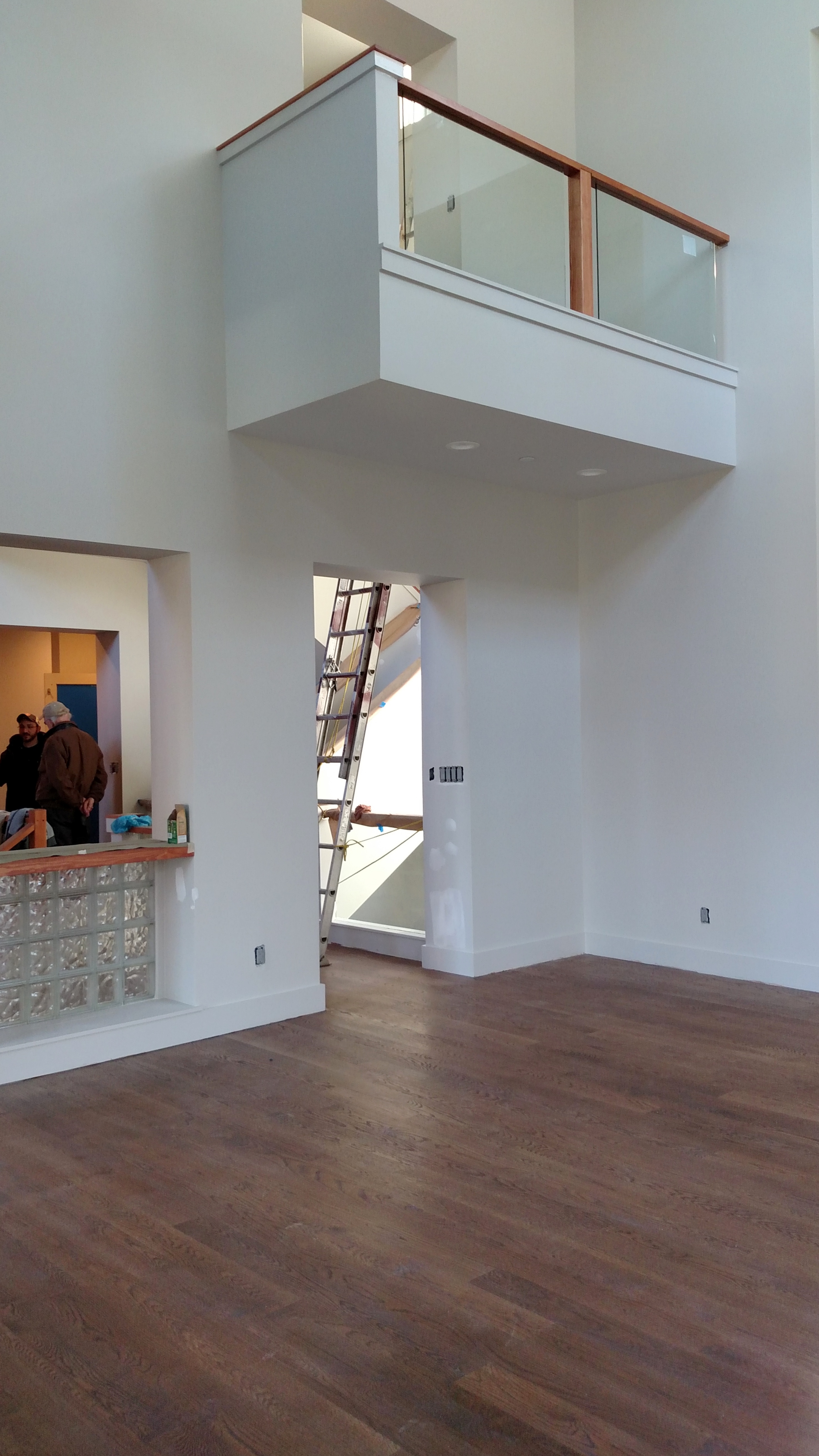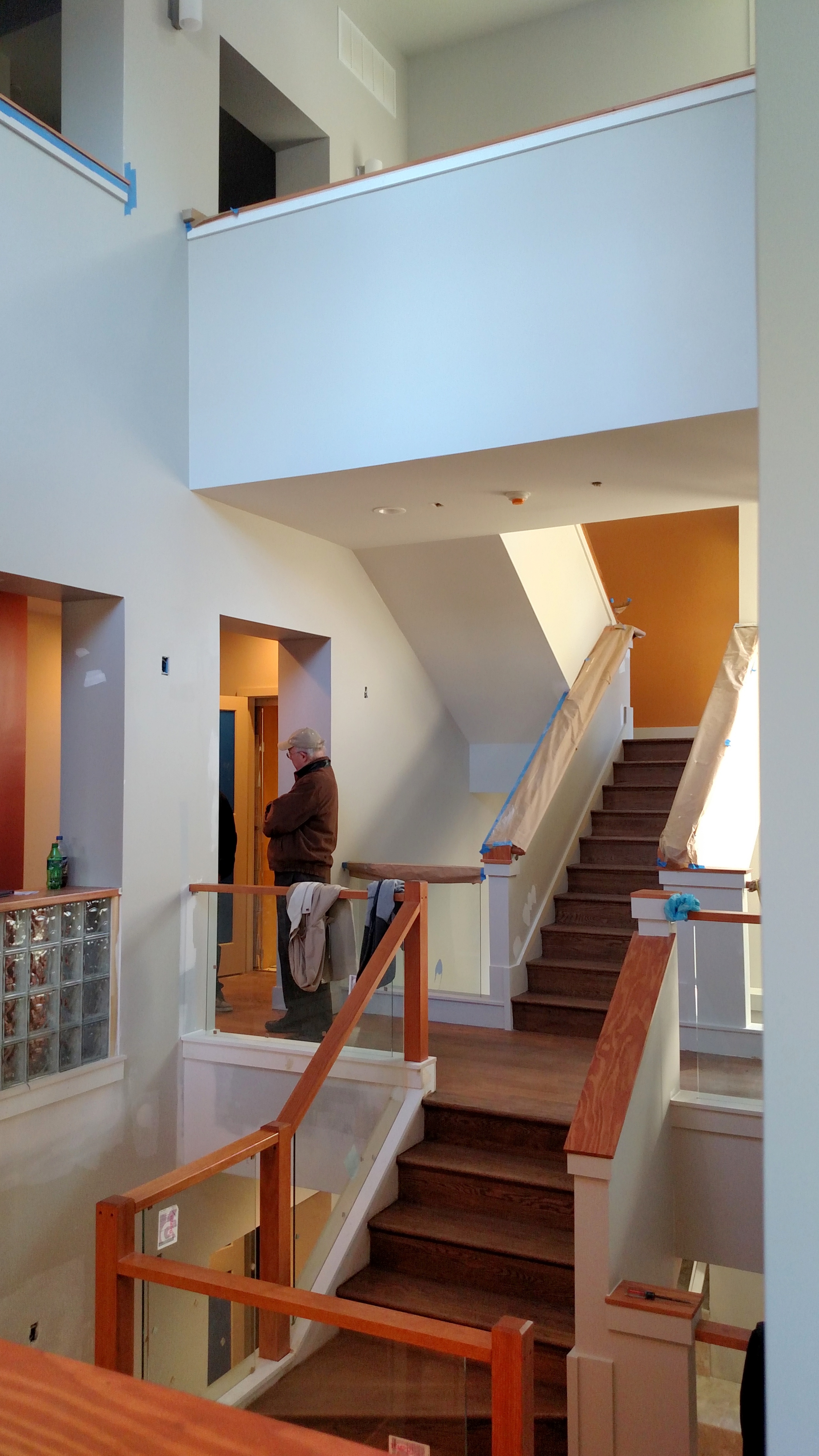 Inside, the wood floors are in place and stained but not yet sealed. The transparency of the rooms as they move around the 3-story atrium, filled with glass block, stairs and bridges, show the interior progress.