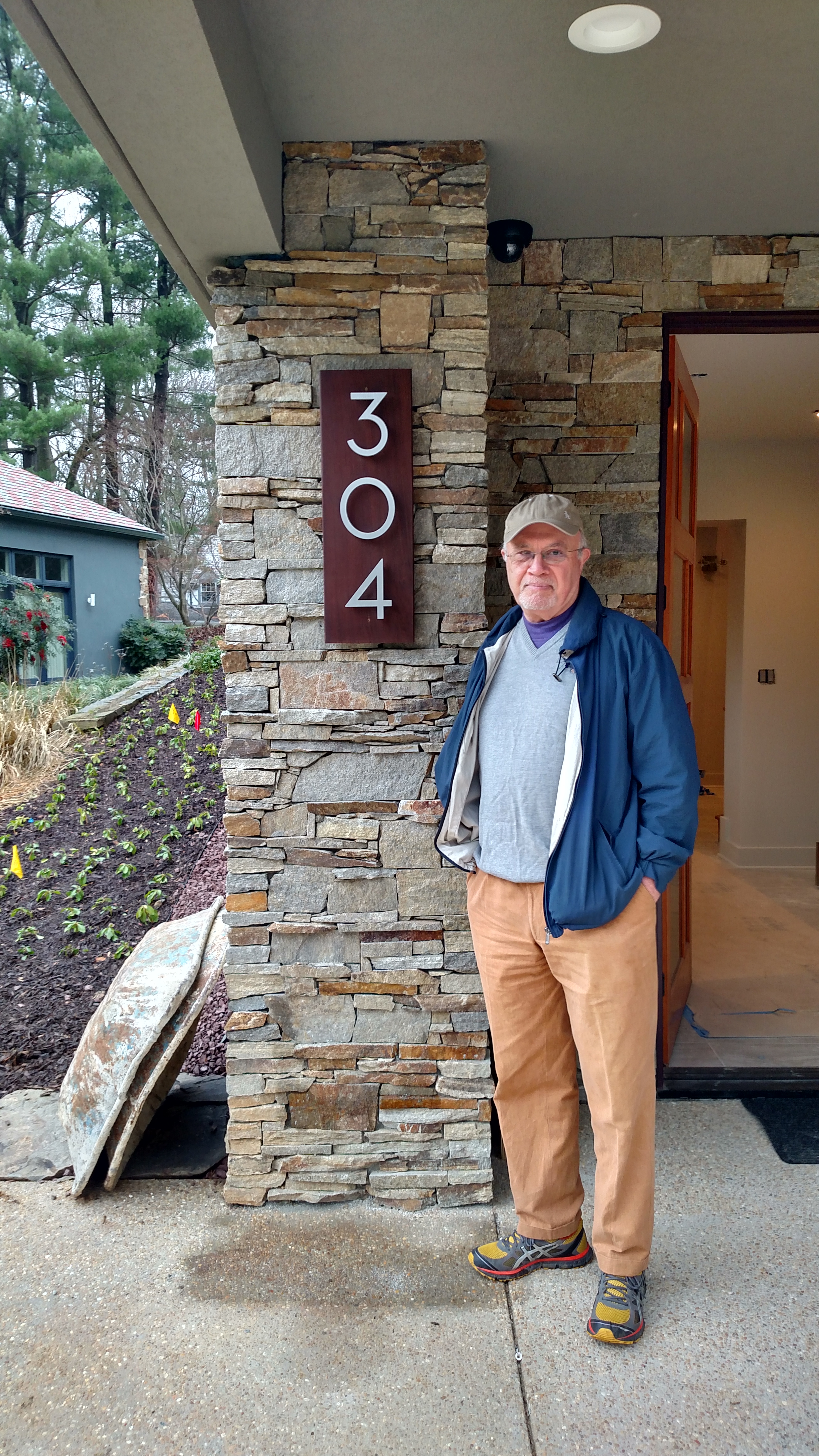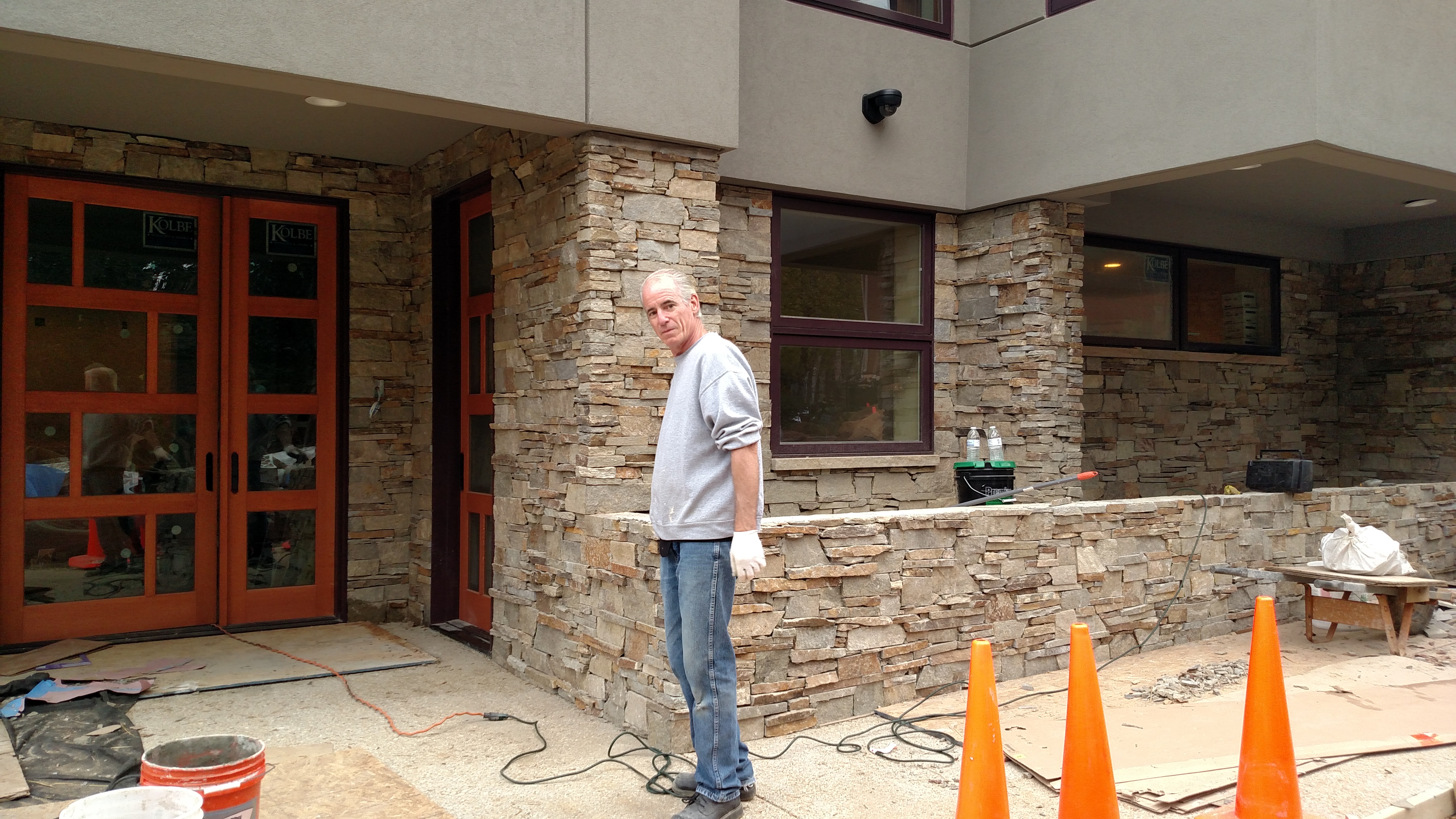 The stone is going up on the front door (that’s one our gifted stonemasons) brought to our site by Andrew Deschler of Classic Craftsmen, our contractor.