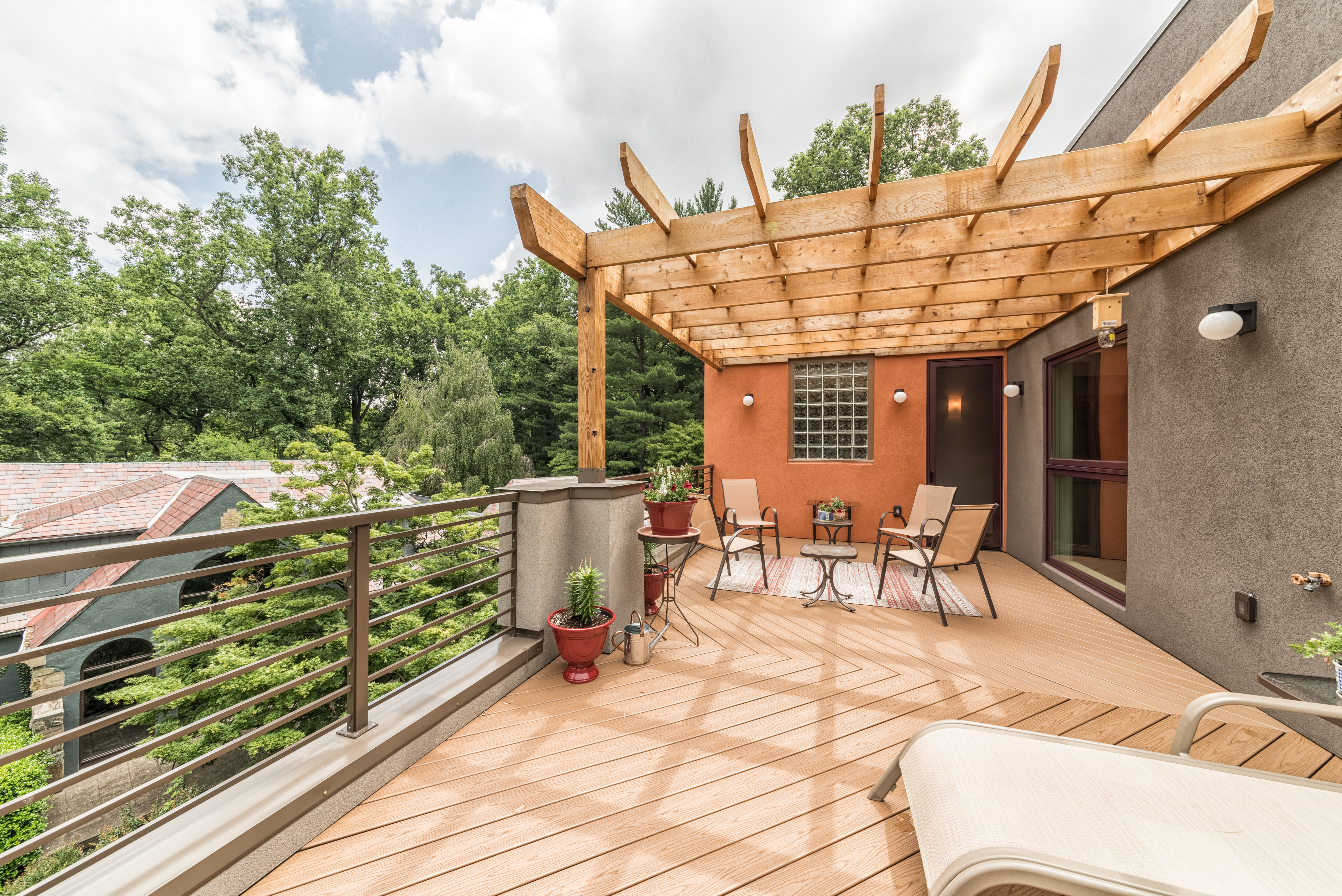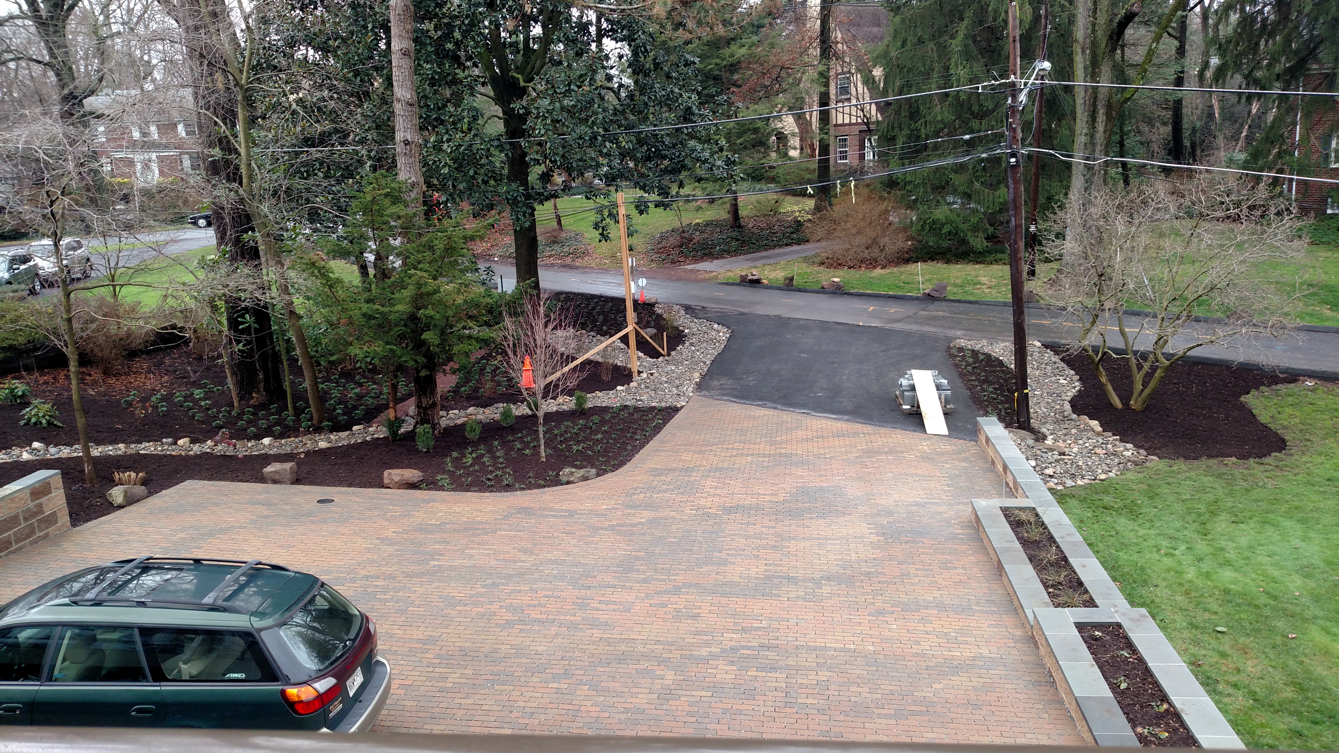Landscaping, finishes, permeable paver driveway, a new retaining wall / planter (ingenious idea from Tad) protecting the grade differential between our house and my Dad’s property, is complete! The cedar trellis on the upper sun deck is in place. The landscaping is complete.