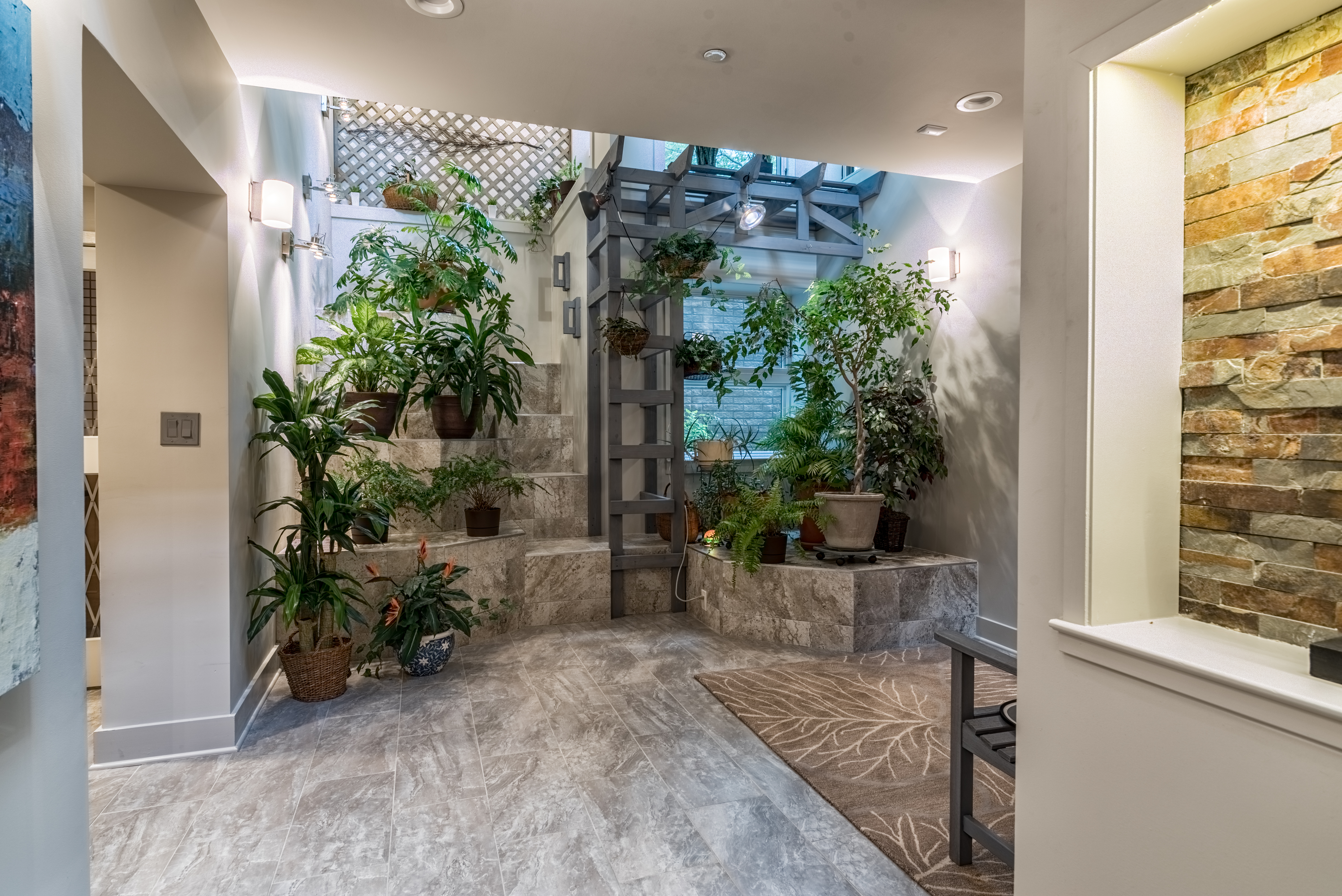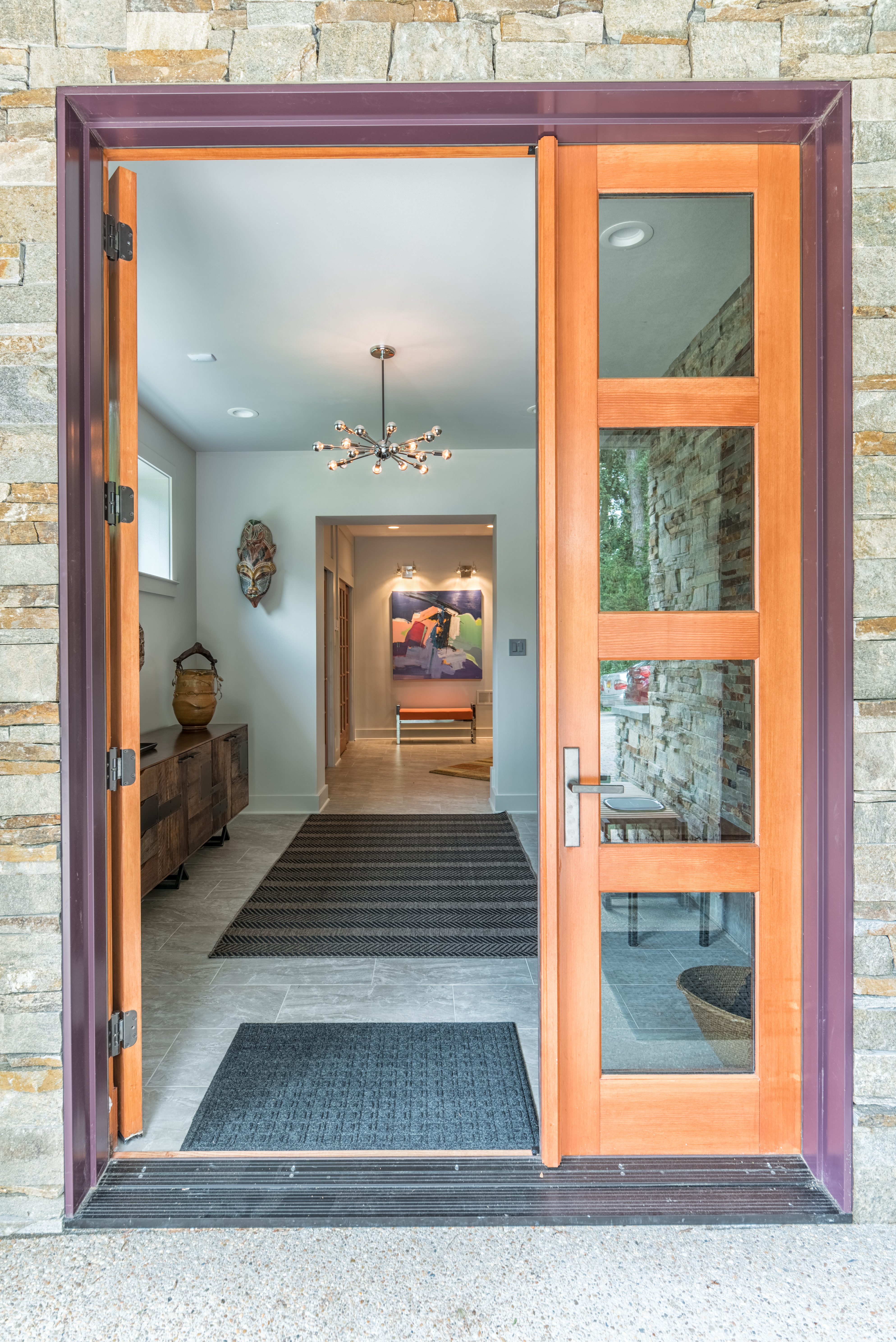 In the foyer, this is the entry way wall of tile, mimics the stone on the exterior.