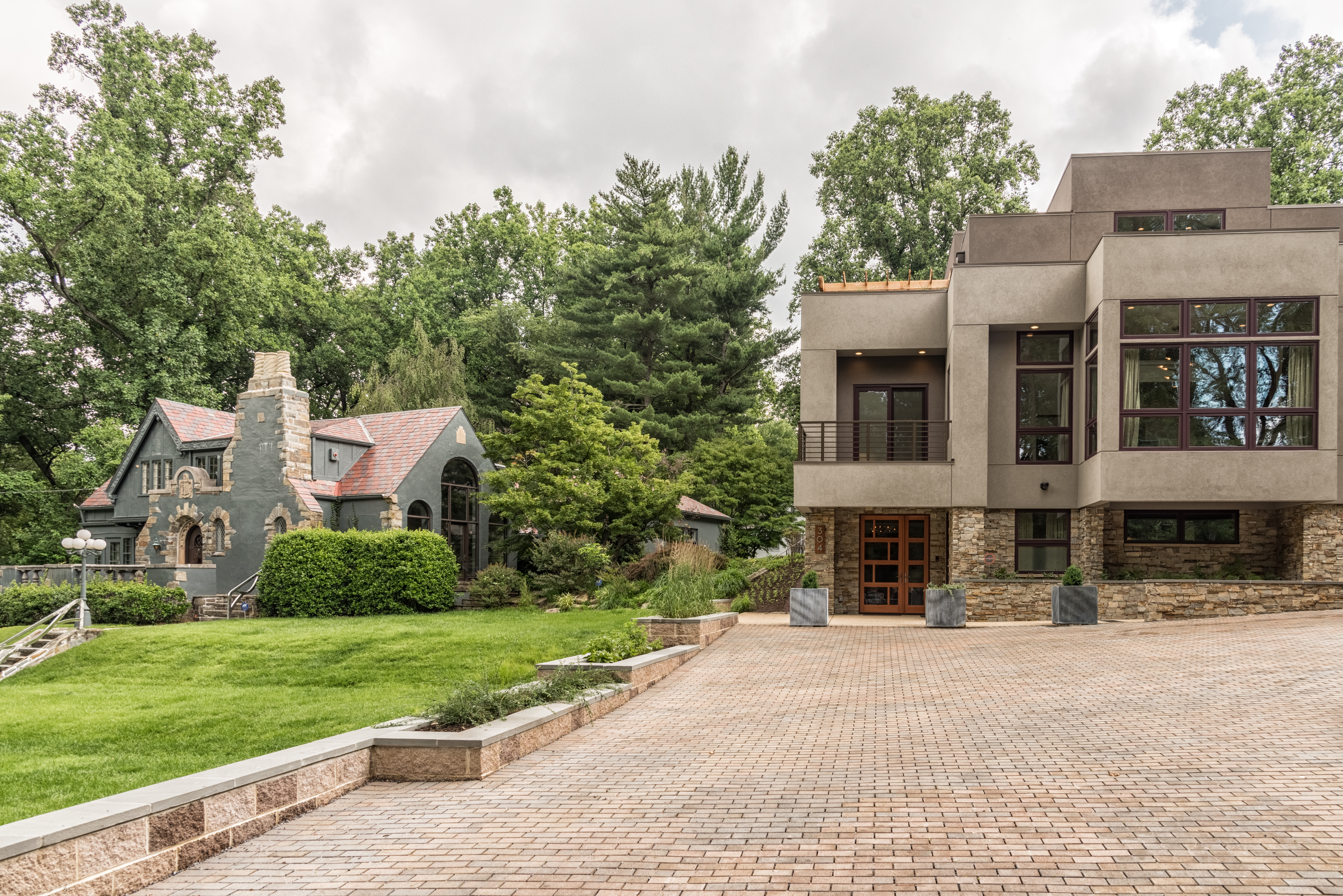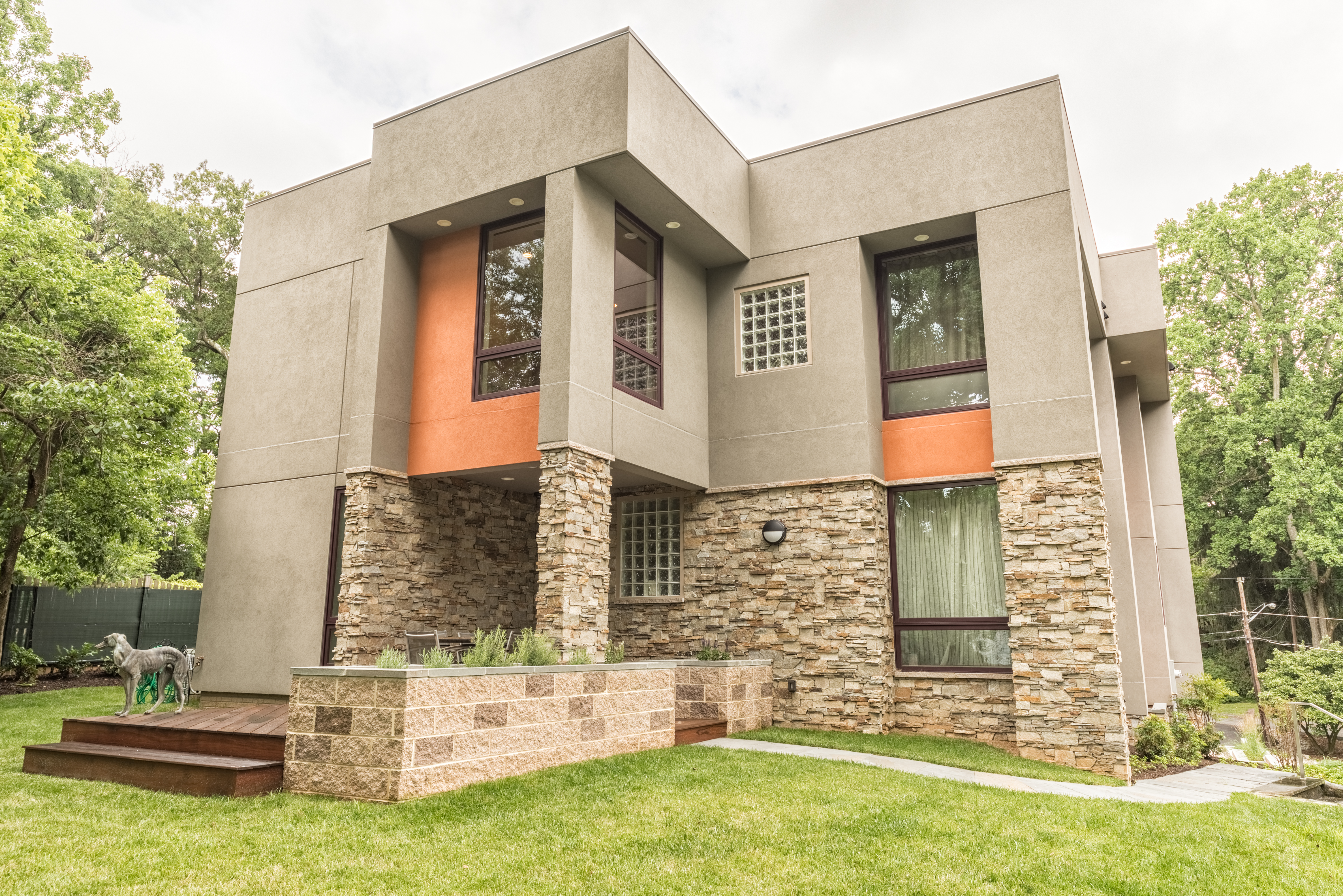Stone veneer on the first floor, applied by master craftsmen.
